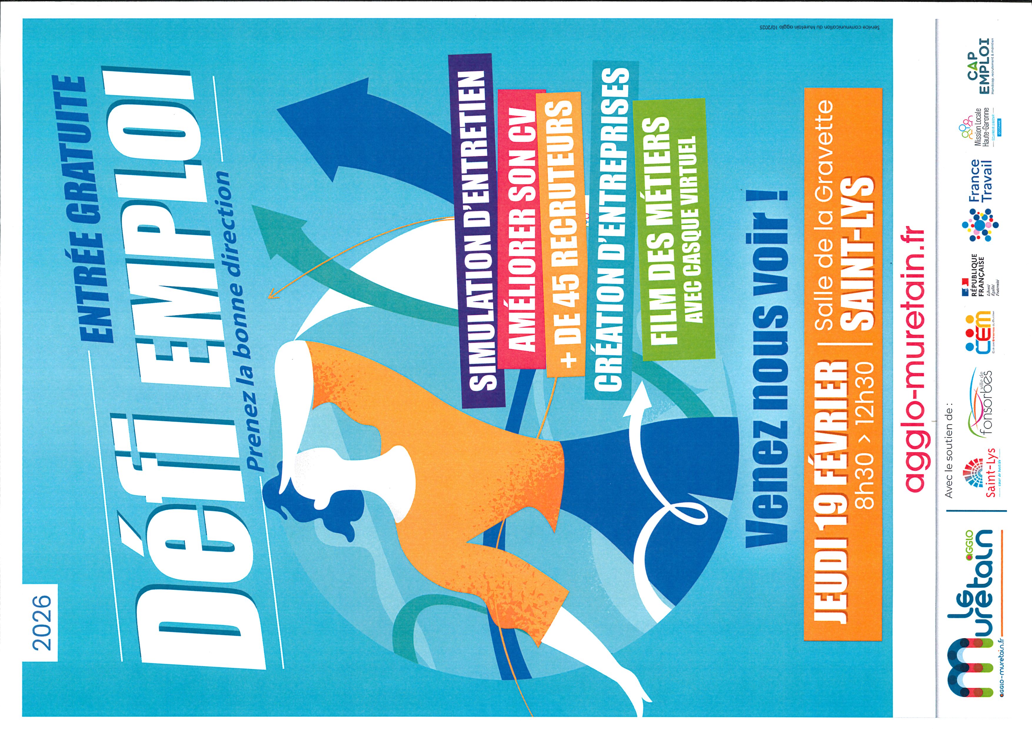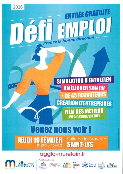 Le Muretain Agglo a fait de l’emploi et du développement économique une priorité. Dans le cadre de ses actions, et en partenariat avec les communes de Fonsorbes, et Saint Lys, de France Travail, de la Mission Locale et du Club des Entreprises du Muretain, le Muretain Agglo organise une nouvelle édition de son Défi Emploi le 19 février 2026, salle de la Gravette à Saint Lys de 8h30 à 12h30.