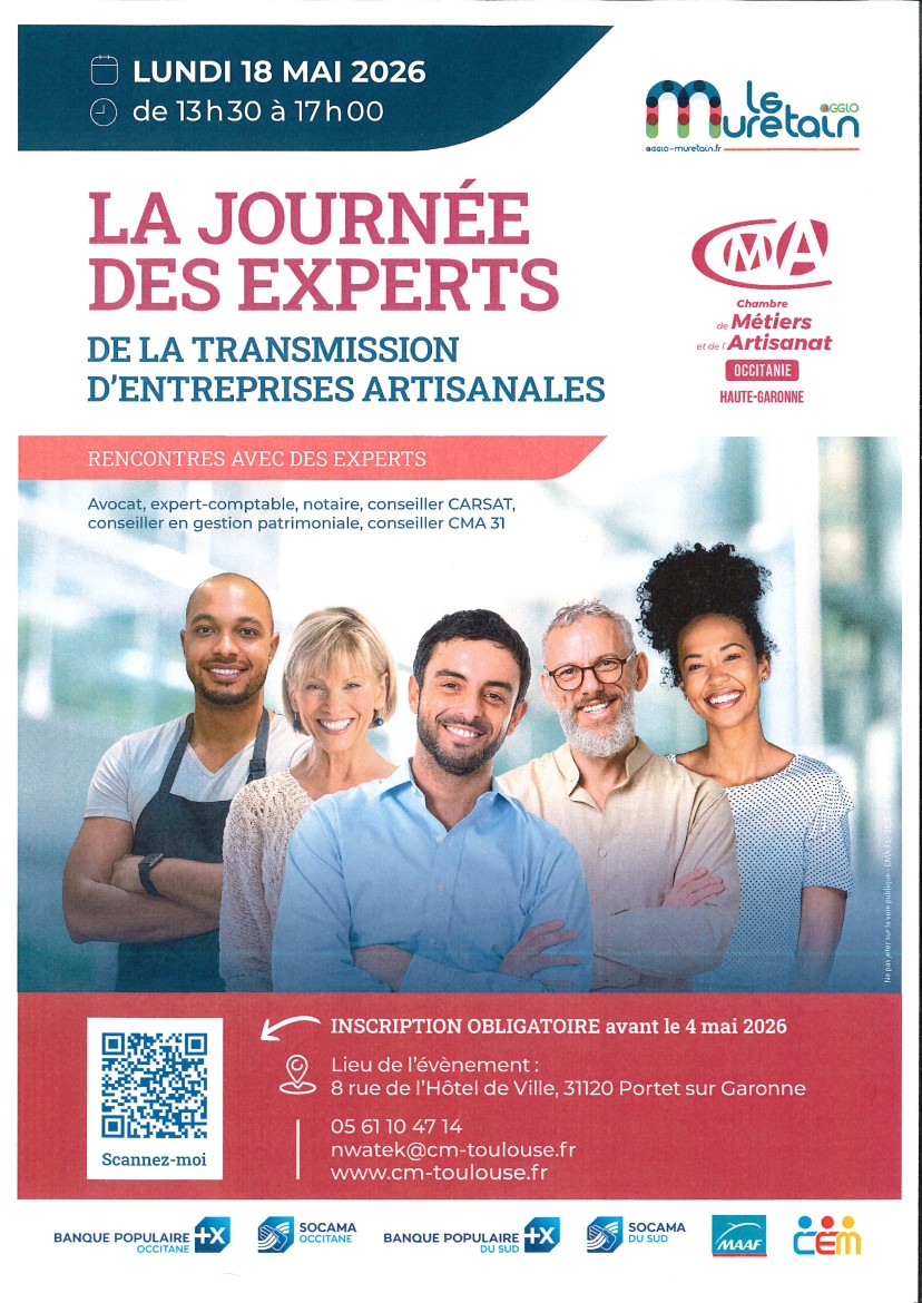 Pour aider les artisans à préparer au mieux ce projet, la Chambre de Métiers et de l’Artisanat Région Occitanie/ Pyrénées-Méditerranée - CMA de Haute-Garonne et le Muretain Agglo, invitent les chefs d’entreprise à la Journée des experts de la transmission d’entreprises :